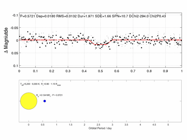 A diagram of the signal of a transiting extrasolar planet candidate discovered by the Nanjing University team, and its size as compared with and distance from a fixed star.