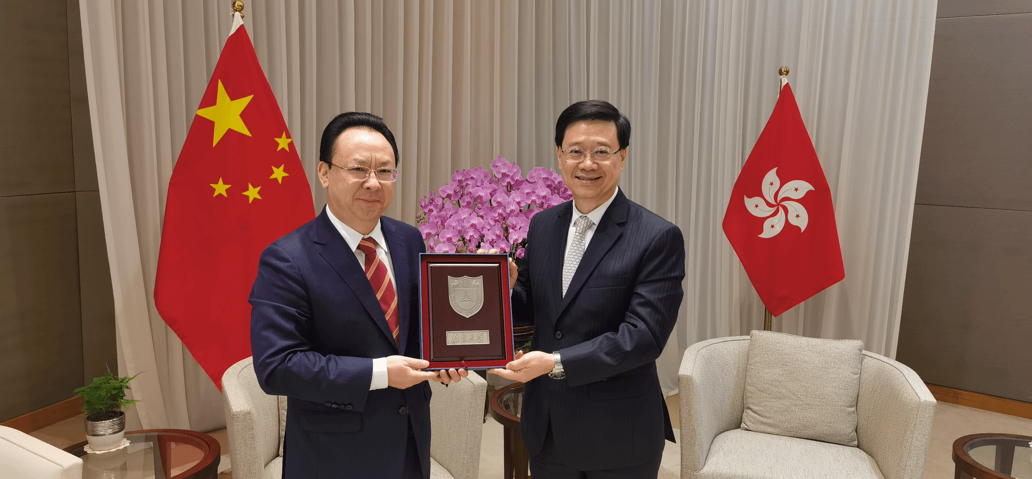 On the morning of April 12, Tan Tieniu and his delegation visited John Lee Ka-chiu, the Chief Executive of the Hong Kong SAR, to discuss promoting scientific and educational cooperation and exchanges between NJU and Hong Kong. The focus was on scientific and technological innovation, cooperation in student cultivation, talent exchange, and the industrial application of fundamental research.