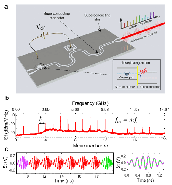 图2. 片上集成超导微波频率梳。a,该频率梳信号源由超导约瑟夫森结与超导谐振器耦合构成,仅需一个直流信号进行驱动。b,辐射的信号在频谱上为一系列等间隔的谱线。c,对应的时域信号为一系列高度相干的脉冲微波信号。