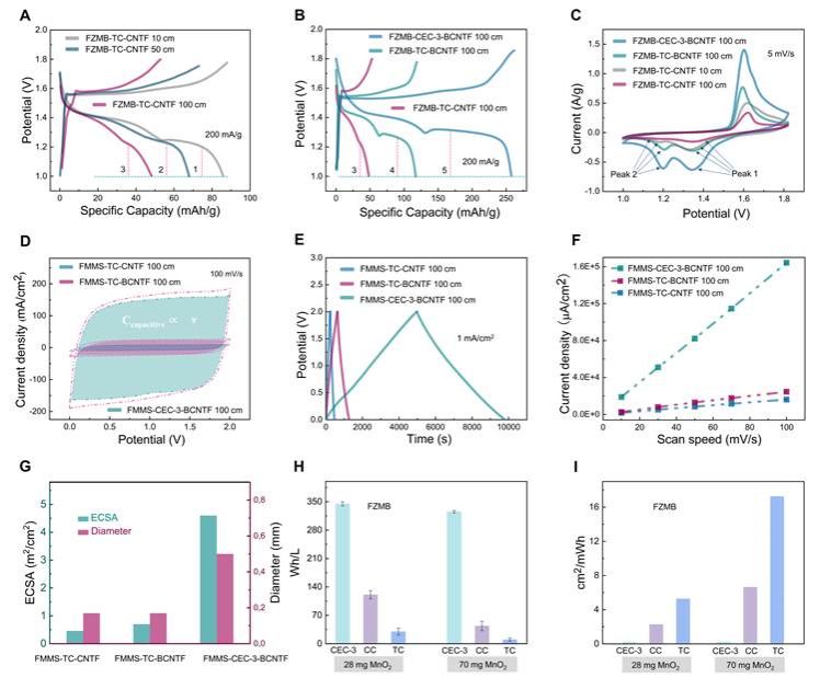 为了稳定有效的实现纤维状储能器件的径向可扩展,凯发k8官网姚亚刚/北京大学张锦院士团队连同鲁汶大学Jan Fransaer和浙江大学张漩团队提出了一种同步扭转的策略用于器件的组装。结合最优的电极排布,这种策略不仅实现了器件的径向可扩展性,还确保了多个纤维正负极之间均匀的电流分布和稳定的力学排布。以此策略为蓝图制备的水系锌-二氧化锰能量存储织物的能量密度达到86.9 Wh·m?2。在相同的活性材料载量下(70 mg MnO2),基于三层同轴扩展结构的纤维状水系锌-二氧化锰电池的能量密度分别超过传统缠绕结构和同轴结构的30倍和7倍。随着扩展层数和活性物质载量的增加,这一优势会更加明显。