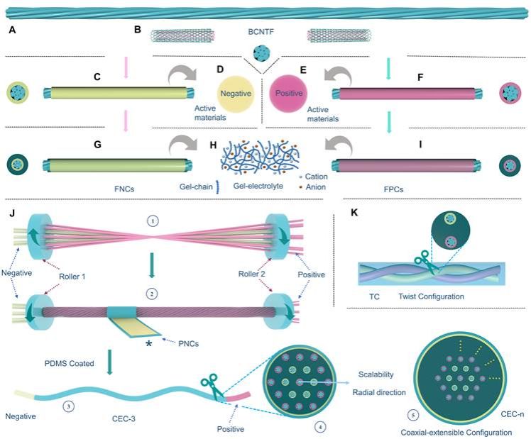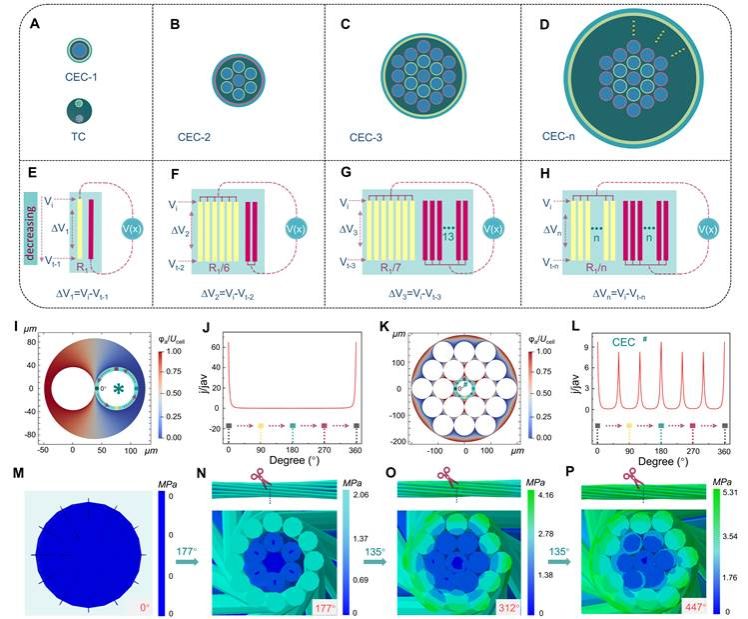 类比于硅基芯片领域中朝着三维方向的堆叠去提高芯片的性能,纤维储能器件的径向可扩展性是一个很有潜力的可以有效提高器件性能的研究领域。然而,纤维状储能器件的径向可扩展通常会涉及多个纤维电极的不同排列,而且器件在实际应用中不可避免地会受到弯曲和拉伸以及其它外力的影响。不幸的是,现有的纤维储能器件的制备方法不仅无法满足多个电极之间的稳定的力学分布,更谈不上去探究电极间不同的结构排布对器件电化学性能的影响。