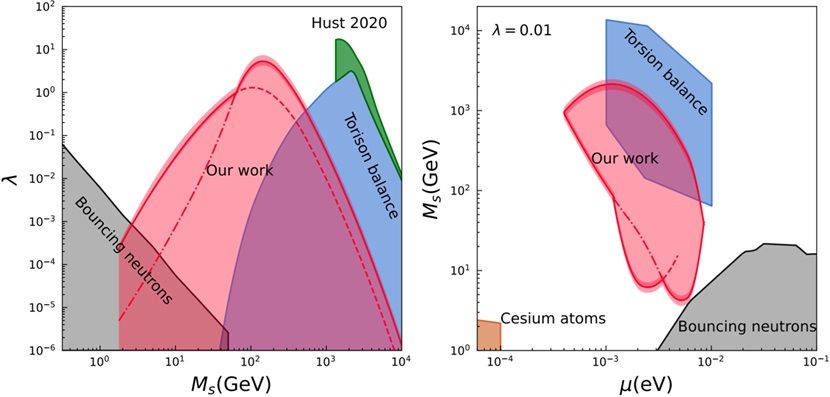 图2. 本研究中暗能量检测结果:对称场暗能量场与普通物质的耦合界限,λ-Μ参数平面(左)和Μs-μ 参数平面(右)。各染色区域代表被实验检验并被排除的参数区间,红色区域代表本研究结果。