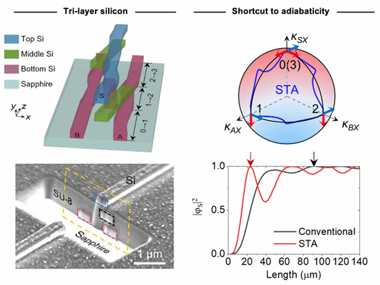图2. 在三层集成硅波导中利用绝热捷径策略实现快速编织效应。