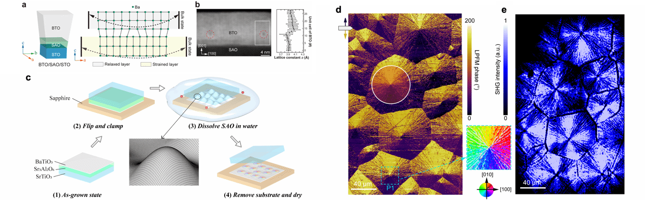 然而,常见的铁电极化拓扑结构在空间上被限制在纳米尺度,与激光模式存在显著的尺寸不匹配,无法直接应用于光场调控。如何在铁电氧化物中设计特定拓扑结构和尺寸的极化织构,以与激光模式兼容,面临重大的挑战。为解决上述问题,研究团队创新性提出一种利用三维形变来构筑更大尺寸(微米)的极化拓扑结构的新思路。通过在一种柔性的铁电薄膜中引入鼓包结构,利用晶格畸变产生径向挠曲电场,进而诱导形成中心汇聚型的拓扑微畴结构(图1b-1e)。在实验中,该团队制备了具有双层不同应变状态的钛酸钡(BaTiO3)自支撑薄膜,这种可弯曲的柔性薄膜在释放应力的过程中,自发形成了鼓包结构,从而获得了微米尺寸的中心汇聚型拓扑畴(图2)。