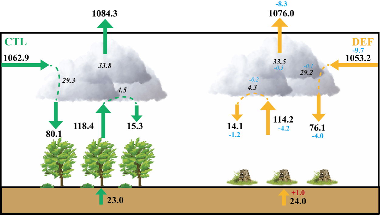 近年来,全球森林覆盖率持续下降,其中以赤道地区的巴西尤为显著。2003年,巴西年森林流失面积一度超过40,000 km?,居全球之首。热带森林不仅是全球生物多样性和陆地碳储量的重要载体,也是全球栖息地变化最剧烈的地区。因此,遏制森林砍伐和退化对于缓解气候变化和生物多样性丧失具有重要意义。森林覆盖减少显著改变了地表能量平衡与区域水循环,进而对农业、水资源和生态系统造成广泛影响。然而,降水对森林变化的响应机制仍存在较大不确定性,尤其是现实情境下森林砍伐对降水的具体影响尚缺乏系统研究。
