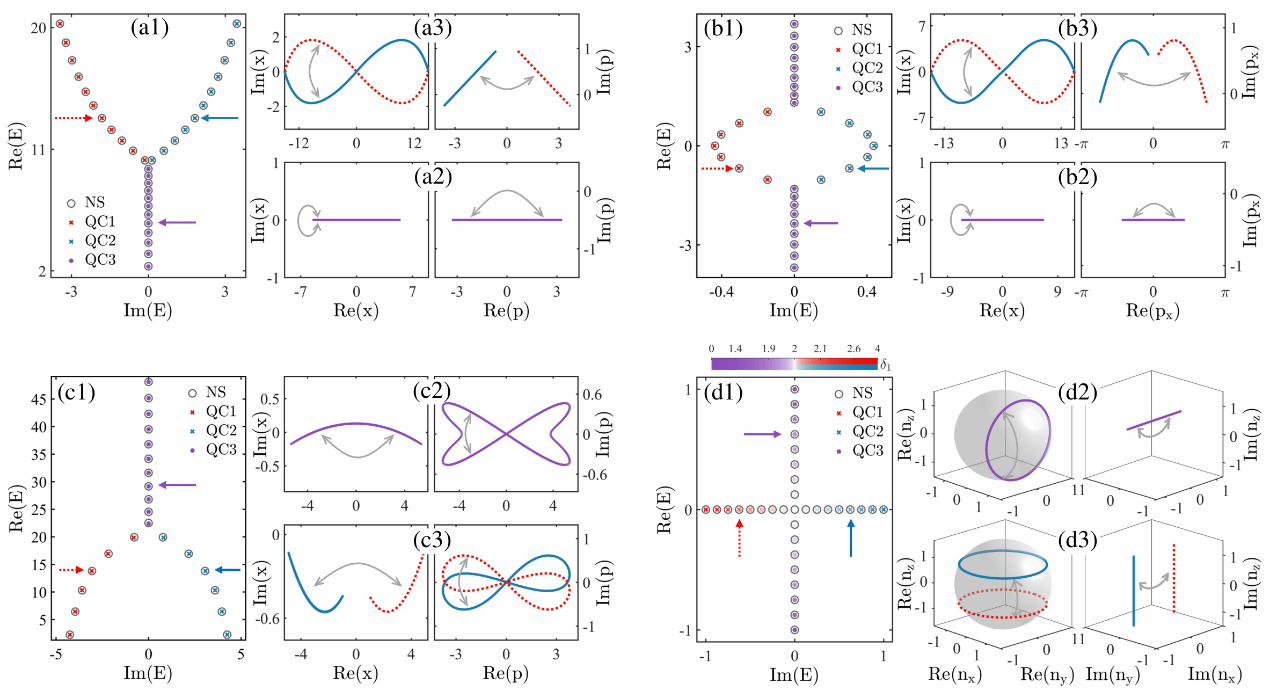 图1. 非厄米物理的量子-经典对应关系。(a) 量子特性与经典特性通过求迹公式相互关联。(b-d) 非厄米能谱与半经典轨道对应关系示意图。(b) 由实数和复共轭对组成的能谱。(c) 复坐标空间中互为Sη对称的两个半经典轨道,对应成对的复共轭能级。(d) 具有Sη对称的轨道,对应实能量本征值。本征能量与对应轨道采用相同颜色标示,Sη对称操作由灰色双向箭头表示。