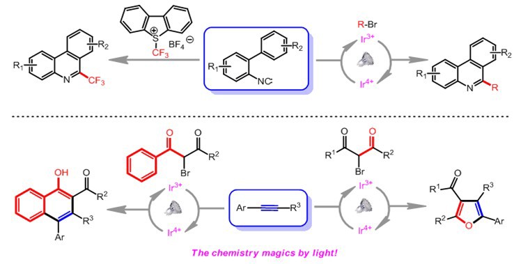 俞寿云课题组和张艳课题组利用各自在有机合成化学和有机光化学领域的经验和积累,合作在可见光促进的氧化还原反应领域进行探索,近期取得了系列进展。他们利用光敏剂经可见光激发跃迁后所具有的还原性,实现了多种多取代芳香化合物新的合成方法。例如,利用异氰作为自由基受体来制备多取代菲啶(Angew. Chem. Int. Ed., DOI: 10.1002/anie.201308376)。该反应是第一例利用可见光促进的自由基异氰插入反应,与传统的自由基异氰插入反应相比,由于整个催化循环过程是氧化还原中性的,因此无需添加当量氧化剂,同时也避免了高毒性的有机锡试剂的使用,是一种温和、高效的制备6位烷基化菲啶衍生物的方法。他们还实现了6位三氟甲基化的菲啶衍生物的简洁的合成方法(Org. Lett., 2013, 15, 5520)。与此同时,他们还报导了一种利用1,3-二羰基溴代物在光氧化还原催化条件下来制备多取代呋喃及多取代2-萘酚的方法(Org. Lett., 2013, 15, 4884)。