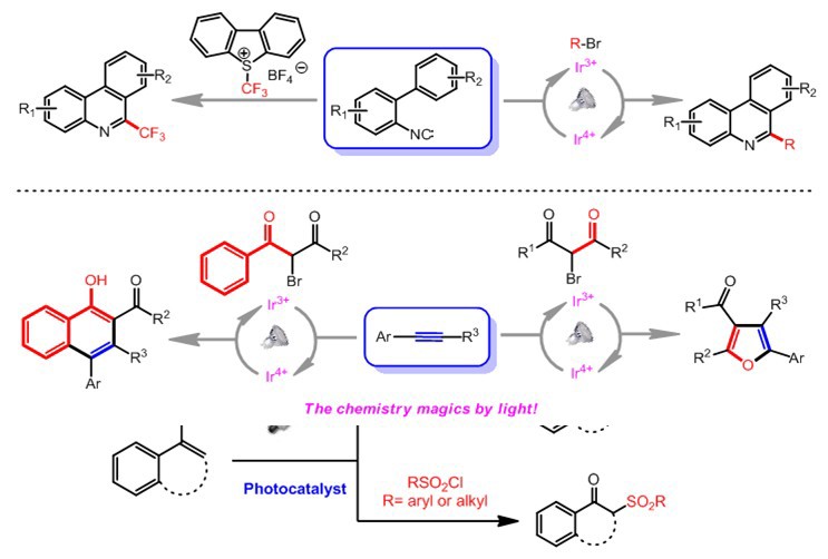 有机光化学已经有超过百年的历史,但绝大多数工作集中在紫外光促进的化学反应上,比如[2+2]环加成,卤化等。由于紫外线能量高且对人体有害,所以紫外光促进的反应需要特殊的光源(比如高压汞灯)和设备(紫外灯箱)。而且高能量的紫外光可以破坏的化学键较多(包括有机化合物中最常见的碳碳键和碳氢键),因此紫外光促进的有机反应的副产物比较多。这些都限制了紫外光化学的应用。众所周知,太阳能是地球上最理想的能源,它是一种取之不尽用之不竭的清洁免费能源。如果能直接利用太阳能作为能量来源将其转化为化学能促进化学转化,那么化学转化将会更加的高效经济且环境友好。太阳光主要是可见波段的电磁波,只包括少量的紫外线和红外线。如果能够直接利用太阳光(或者可见光)促进有机反应将非常有意义。通常的有机小分子是不能直接吸收可见光的,为了解决这一难题,实现可见光促进的有机反应的主要方法是使用光敏剂(或者光催化剂)。光敏试剂在可见光的照射下,由基态跃迁到激发态,激发态的光敏剂除了经历物理衰减回到基态,还可以经历化学“去活化”,将光能转化成化学能,从而促进化学反应。如果光敏剂在传递能量的过程中伴随着电子的转移,那么就会发生氧化还原反应。利用可见光促进的氧化还原反应可以实现传统有机合成化学难以实现的反应,开发出新型的有机光化学反应和氧化还原反应。