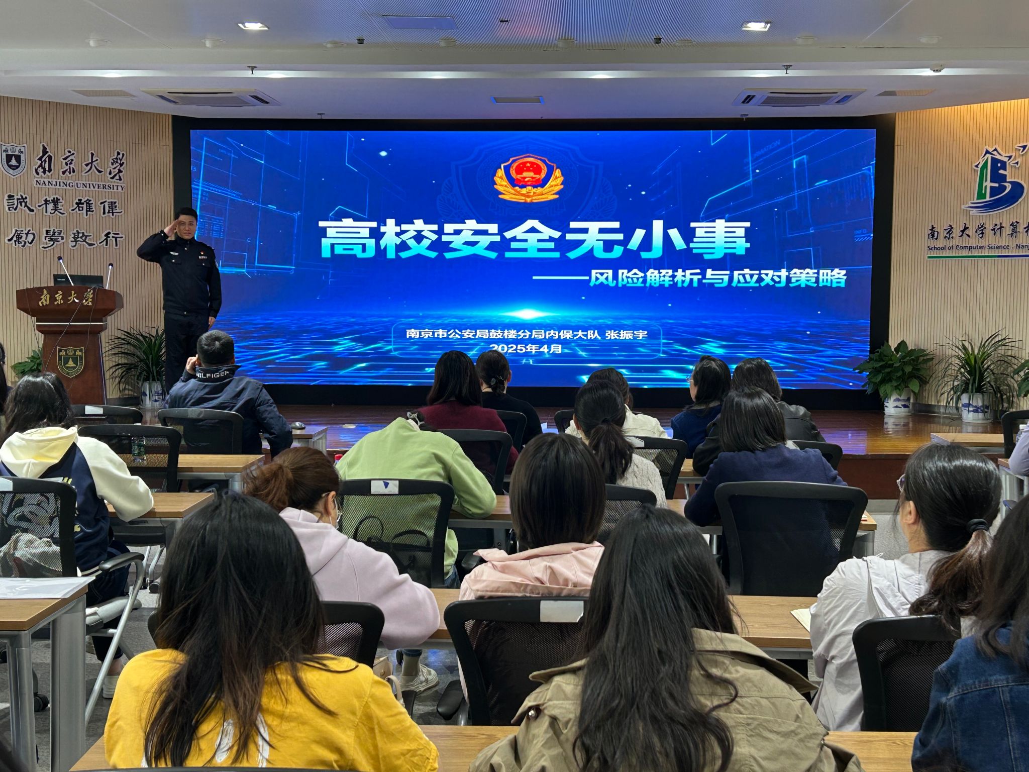 4月14日,学校面向全体辅导员开展安全教育专题培训。凯发k8官网市公安局鼓楼分局内保大队副大队长张振宇分析了当下高校面临的各类安全风险和发展趋势,围绕加强价值观教育和构建家庭、学校、社会三方协作机制,提出了密切关注社会层面热点信息、转变危机化解思路、不断完善应急预案等校园安全应对举措。辅导员们结合培训内容进行了交流。信息管理学院研究生辅导员耿悦曦表示,深刻认识到了维护国家安全的重要性,在日常工作中要注意研究生保密安全教育,促进导师联动,将学术规范与保密教育融入日常管理,强化学生保密安全意识,筑牢思想防线。生命科学学院辅导员祝安琪表示,身处学生心理健康安全教育的前沿阵地,守护学生心理健康安全是自己义不容辞的使命。她将通过谈心谈话,以耐心、专业和温暖回应同学们的信任,陪伴学生坚定自信地成长。历史学院辅导员田捷表示,将通过加强与宣传部、学工部、保卫处等部门的紧密协作,精准识别意识形态风险,对任何苗头性、倾向性问题做到早发现、早研判、早处置。
